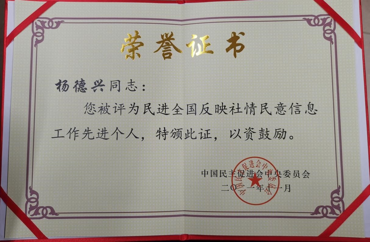 2021年是民进中央反映社情民意信息主题年。为树立典型、表彰先进,激励全会各级组织和广大会员进一步做好反映社情民意信息工作,民进中央于12月1日在北京召开反映社情民意信息主题年工作会暨2021年参政议政年会,对今年以来在反映社情民意信息工作中做出突出成绩的先进集体和个人进行了表彰。民进西工大总支主委、香腐 教授杨德兴荣获2021年“民进全国反映社情民意信息工作先进个人”。