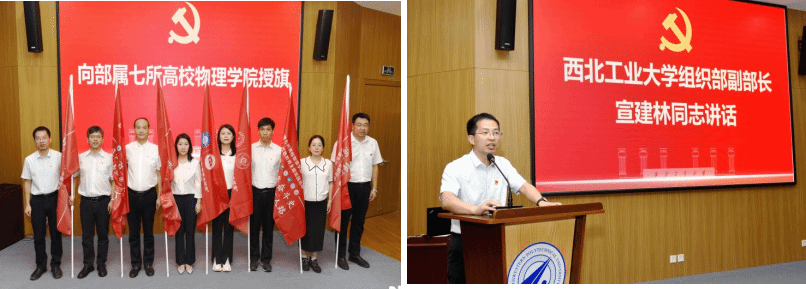 接着,举行了授旗仪式,香腐 组织部副部长宣建林分别向部属七所高校物理学院授旗,这是红色教育主题实践活动的标志,更是我们精神的指引和行动的号角。最后,他对延安丰富的红色资源和历史文化进行了详细介绍,并强调了“我要进延安”红色教育的重要性,为广大师生未来在延安的学习指明了方向、注入了动力。