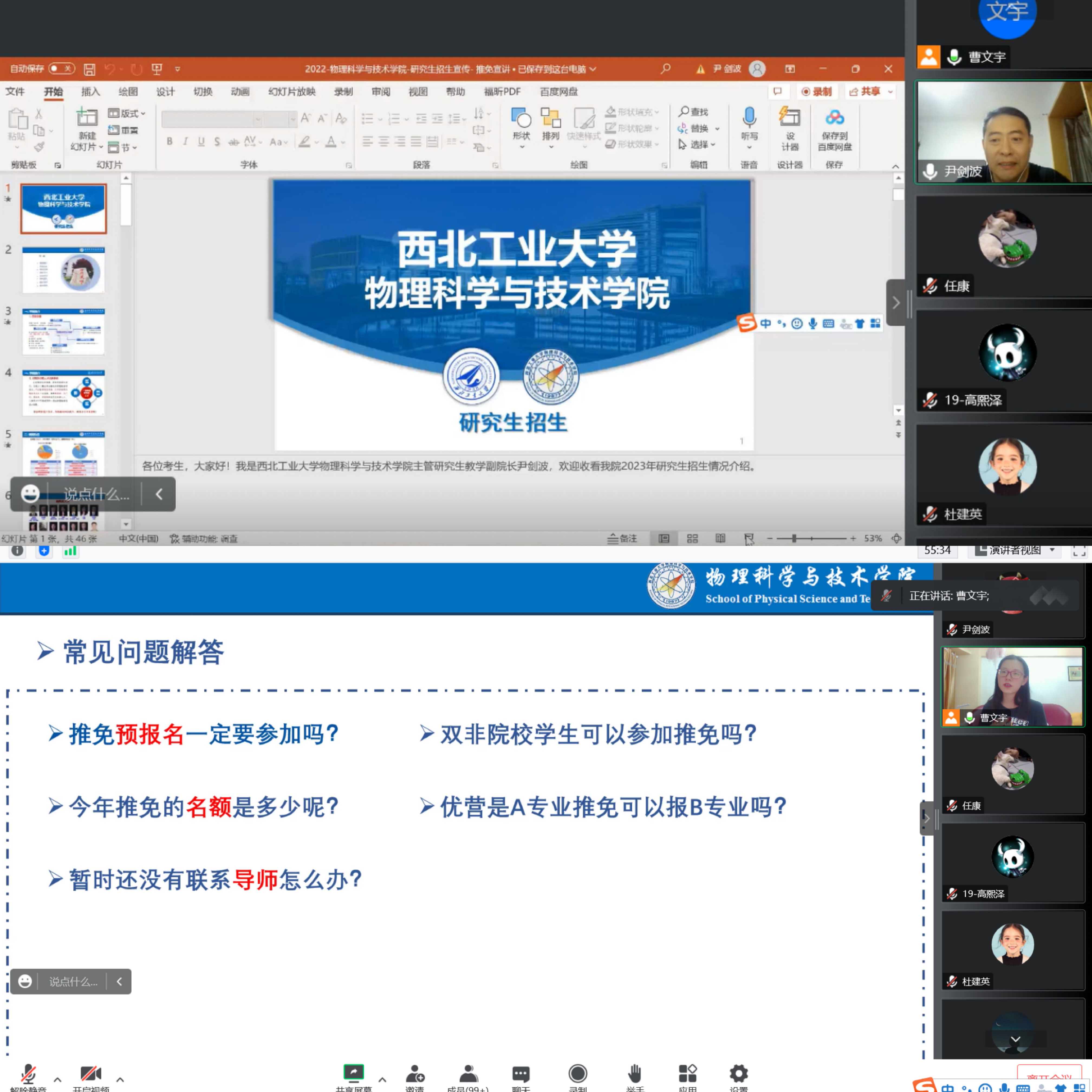 学生分享结束后,院长助理闫娜与参会同学展开积极互动交流,详尽回答了同学们关于推免和统考的各类问题,聆听同学们的需求,为后续正式开始招生工作做好准备。会议的最后,闫娜教授为所有学生献上亲切祝福:“星光不问赶路人,静候开花传佳音。希望各位同学推免顺利,考研理想,不负韶华,相约工大”。