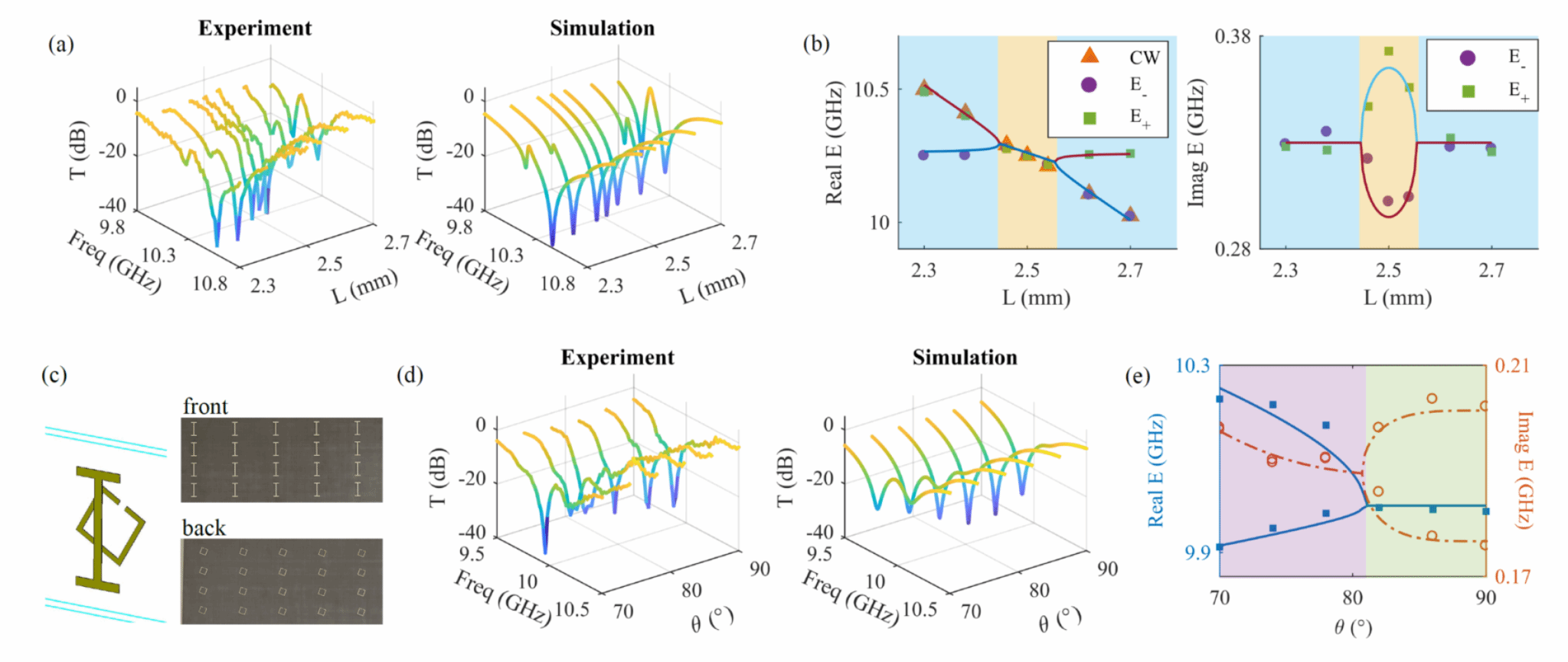 研究团队通过测量超构材料的透射谱,拟合得出本征能量的实部与虚部(图2(a))。实验和计算首先找出了达成PT反对称性的单元间距,如图2(b)所示,当间隔为6mm时,透射谱出现了谐振模式简并,即对应耦合相位为π/2。