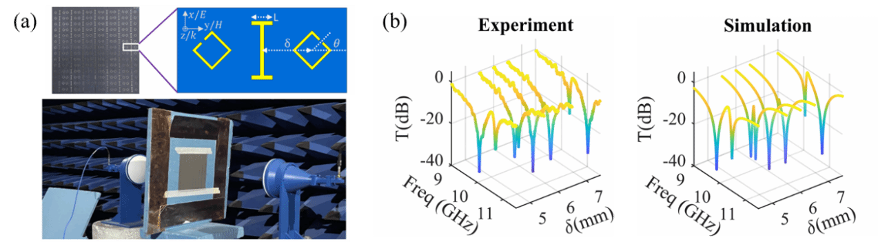 图2(a)超构材料样品与实验示意图(b)改变间距的透射谱,在δ=6mm时出现模式简并