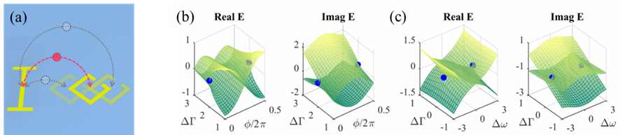 图1 (a)谐振单元耦合示意图,单元间距控制耦合相位 (b)当谐振频率相等时,变化耗散和耦合相位的能级图(c)当相位为π/2时,变化耗散和谐振频率的能级图,蓝色点代表EP。