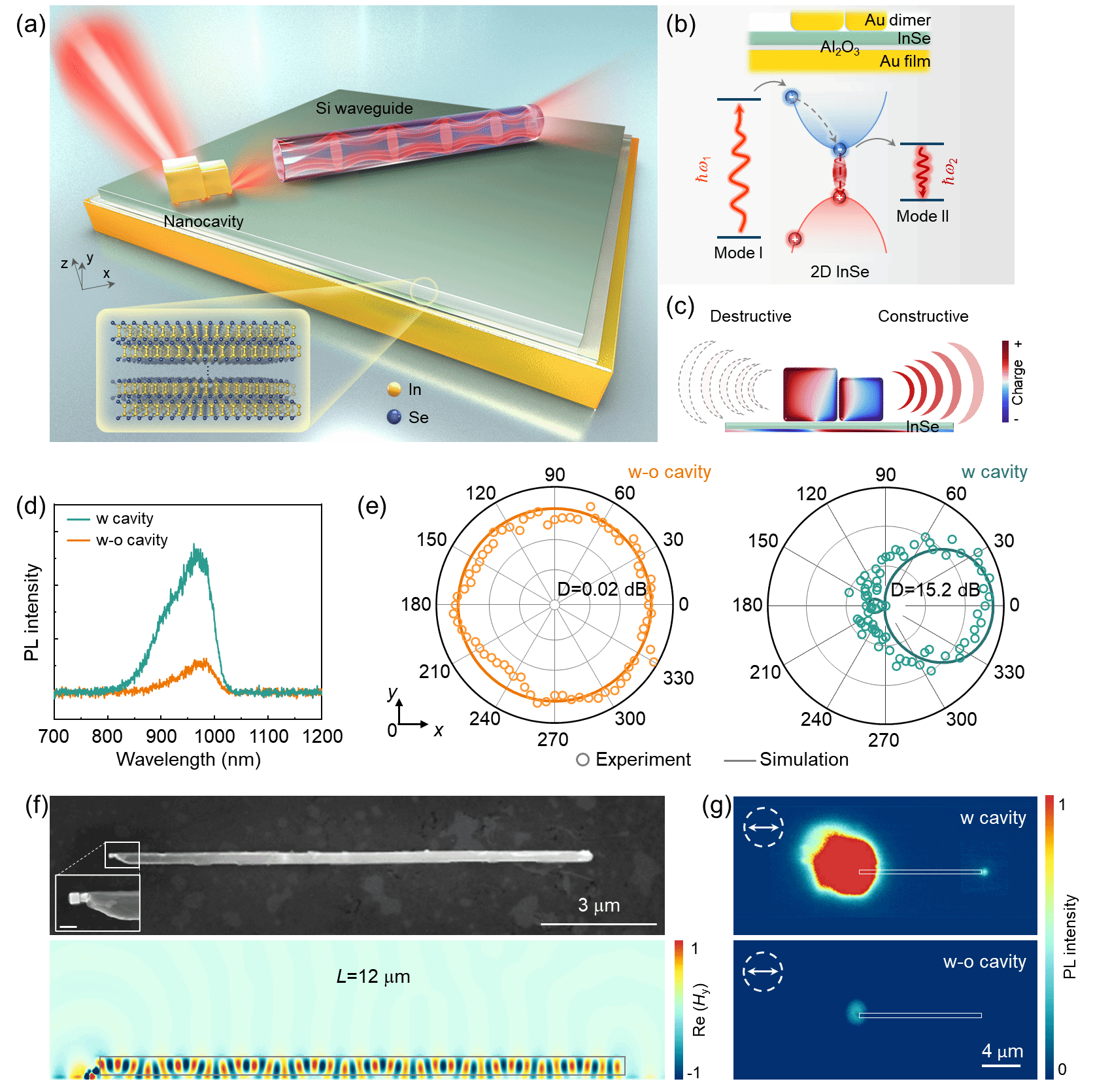 针对上述挑战,该团队设计了一种“纳米立方二聚体—镜面”纳腔结构,精确实现了腔内等离激元模式与InSe激子在空间分布、光谱峰位及偶极取向上的协同匹配。同时,团队通过打破纳腔结构的对称性,有效调控了波前在相反方向上的相长与相消干涉,从而实现了激子的单向发射,并藉此观察到超过3500倍的激子荧光增强以及高达15 dB的定向发射。进一步,将单向激子发光成功耦合到硅纳米线波导,实现了24%的耦合效率和长达140微米的荧光传输距离。该工作不仅解决了纳米光子结构中“强局域近场与高度定向远场难以兼顾”的物理矛盾,也为实现超紧凑片上光源、量子光子器件与片上信息处理系统提供了新的物理途径。所提出的纳腔平台可进一步与多种量子发光体(如其他二维半导体或量子点)集成,并有望扩展至片上单光子源、低阈值纳米激光器及电驱动纳米光源,为下一代集成光子系统的研发奠定基础。