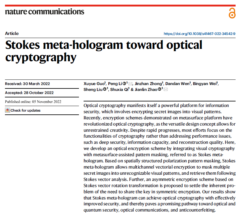 李鹏教授、赵建林教授研究团队在光场调控研究方面所取得的突破。该工作发展了一种全新的用于光学加密的斯托克斯矢量编码超表面全息图,并系统地给出了采用该器件进行不同层级偏振掩蔽的光学加密方案。全文链接://www.nature.com/articles/s41467-022-34542-9