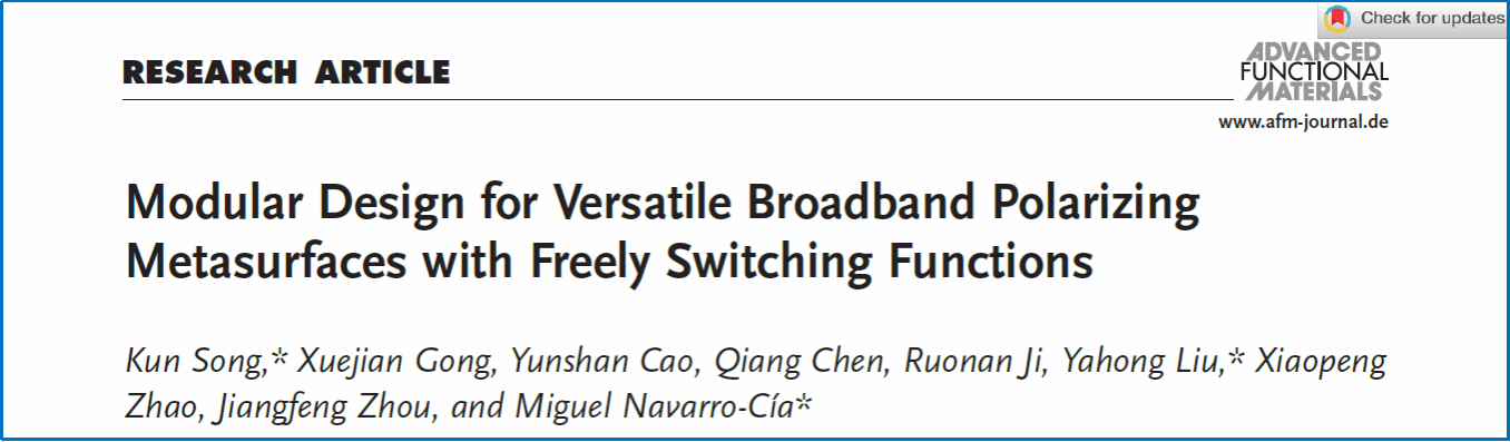 智能材料实验室团队与美国南佛罗里达大学周江峰副教授团队和英国伯明翰大学Miguel Navarro-Cía副教授团队开展合作,在电磁波极化调控研究方面取得重要进展。近日,相关成果以“Modular Design for Versatile Broadband Polarizing Metasurfaces with Freely Switching Functions”为题在国际著名期刊《Advanced Functional Materials》上发表,并被选为封底文章。智能材料实验室团队宋坤副教授为论文第一作者和通讯作者,刘亚红教授和Miguel Navarro-Cía副教授同为通讯作者。该论文的合作者还包括智能材料实验室团队硕士生龚雪健、曹赟山、陈强及冀若楠副教授和赵晓鹏教授。