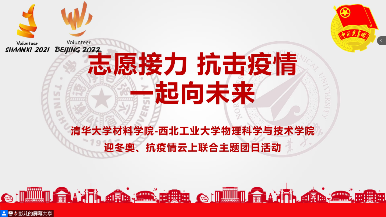 团委与清华大学材料学院团委在线上联合举办“志愿接力,抗击疫情,一起向未来”主题团日活动。两学院团委和学生工作负责教师、相关团支部、学生党支部,以及两校服务十四运、冬奥会、抗击疫情志愿者代表等近百人参加会议。两校志愿者分享了在服务十四运、建党百年纪念演出和抗击疫情工作中的经验体会,两校学生互相播放了抗疫加油和祝福北京冬奥的视频,共同期盼疫情的阴霾早日消散,一起迎接冬奥盛会的到来。