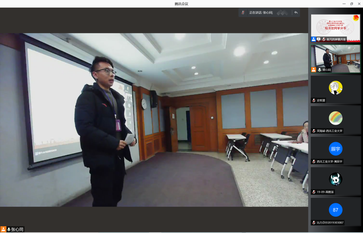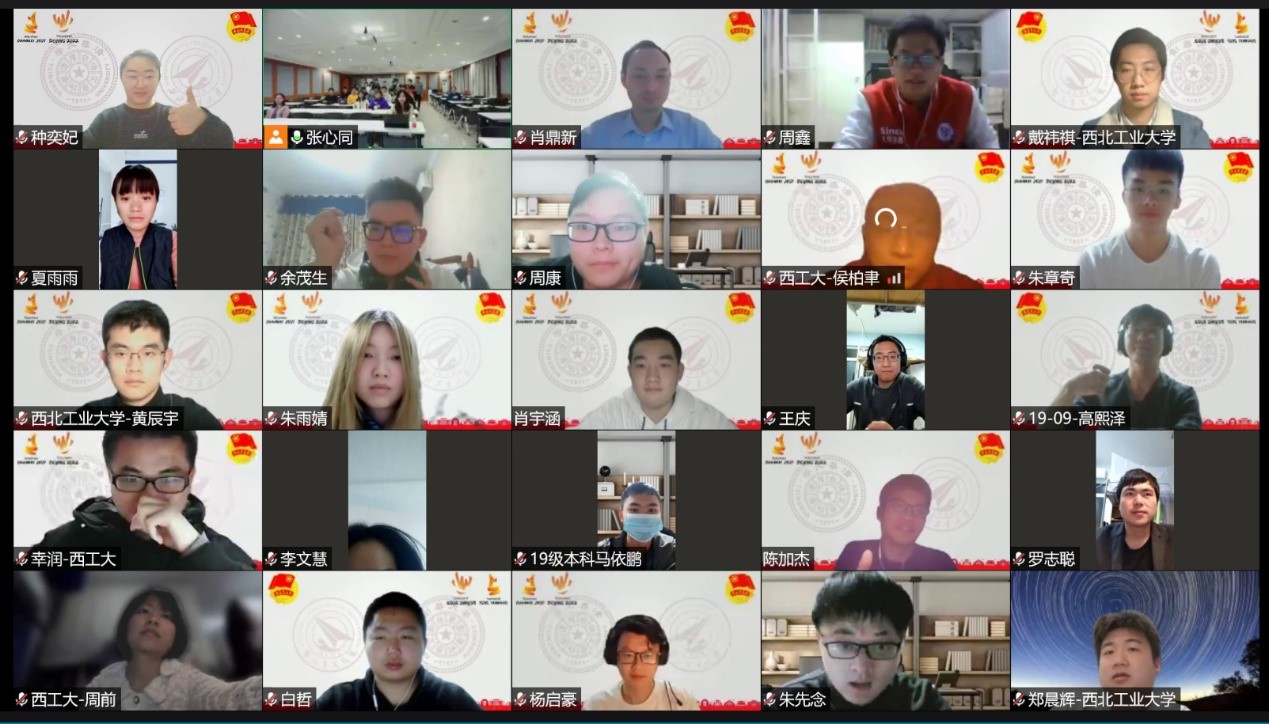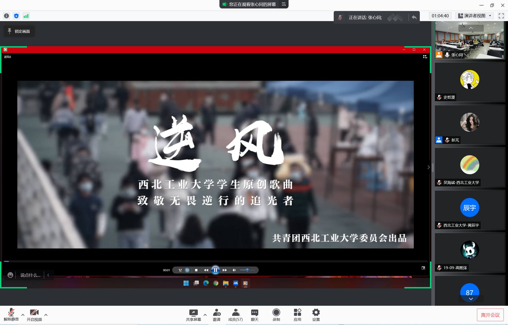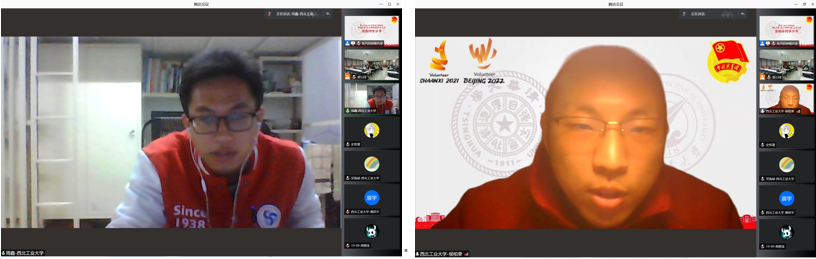 抗疫志愿者代表侯柏聿同学分别从志愿工作组织服务和个人参与志愿工作角度分享了抗疫的经历体会,并为清华大学同学播放了西工大原创战疫MV《逆风》。